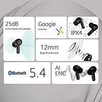 • 25dB Active Noise Cancellation • 12mm dynamic drivers for premium sound • Up to 30 hours total playtime • AI-ENC mic for clear calling • Bluetooth v5.4 with 60ms low latency • Google Fast Pair & app support • IPX4 water resistance