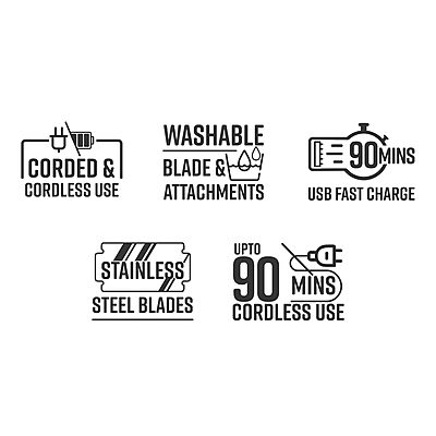 • Runtime: 90 Minutes • Charging: 90-Min Type-C Rapid Charge • Usage: Works Corded & Cordless • Blades: Stainless Steel, Skin-Friendly • Combs: 4 Guide Combs for Precision Trimming • Indicator: LED Charging Indicator • Blade Maintenance: Washable Blade for Easy Cleaning